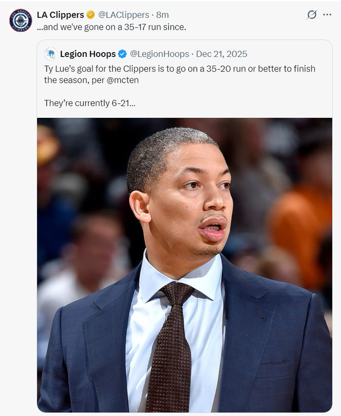 在2025年12月21日快船是6胜21负,但随后快船取得35胜17负,目前战绩41胜38负,快船官方为泰伦卢点赞,因为此前泰伦卢说余下55场比赛要拿35胜20负。